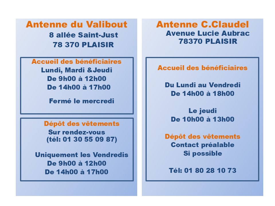 - Organiser, gérer le dépôt et l’attribution de vêtements au bénéfice de la population de Plaisir et de ses environs.